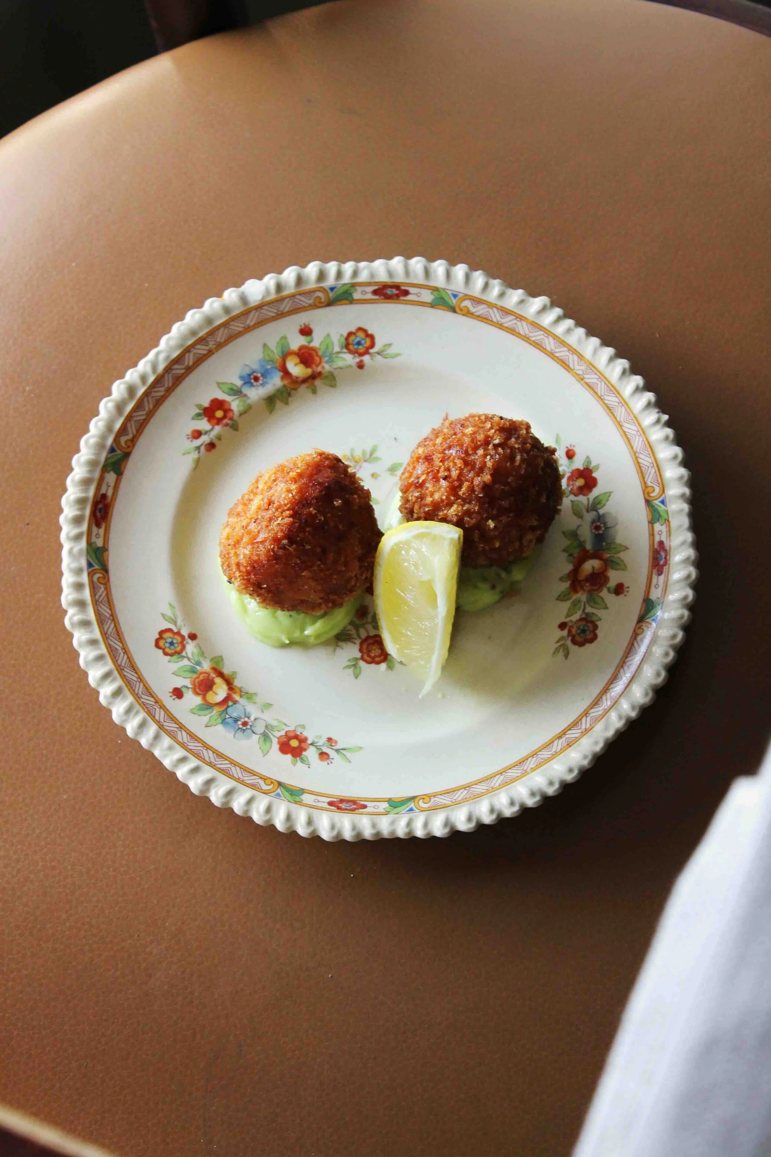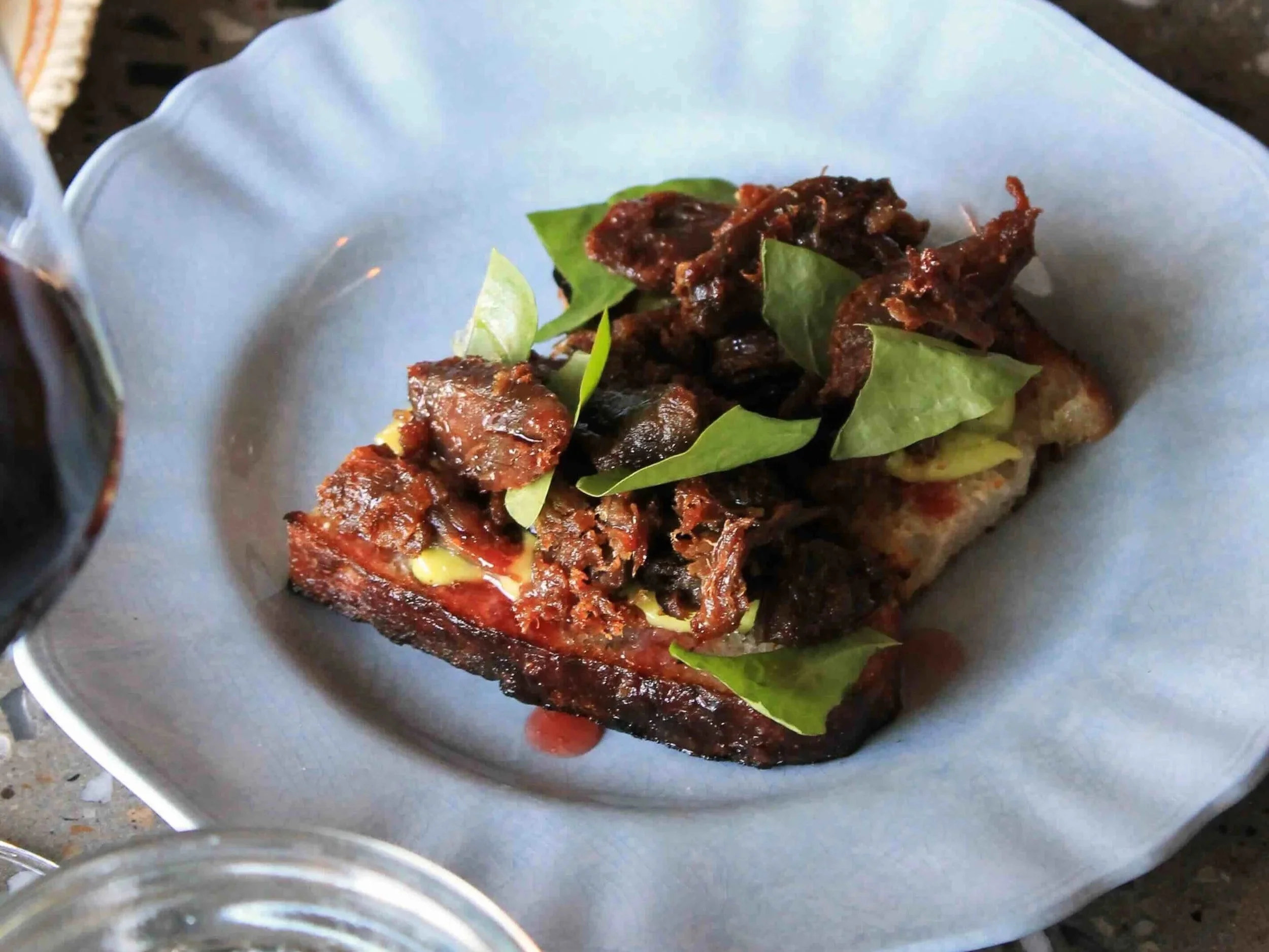 Sprøde og bitre salater vendt i urtedressing og toppet med sprødt brød
